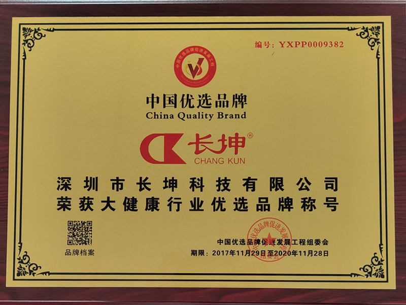 2017年12月,深圳市長坤科技有限公司成功被中國優選品牌促進發展工程選中,評選為“中國優選品牌”,并授予其“大健康”行業優選品牌稱號,以茲鼓勵。